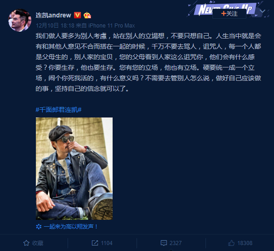 网易娱乐12月11日报道 12月10日,演员连凯在微博发文称“我们做人也要多为别人考虑,站在别人的立场想,不要只想自己。”“不需要去管别人怎么说,做好自己应该做的事,坚持自己的信念就可以了”,疑似是对9日夏河对高以翔去世事件所发布的长文而发声。