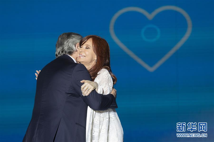 12月10日,在阿根廷布宜诺斯艾利斯,费尔南德斯(左)与副总统克里斯蒂娜庆祝就职。10日,阿根廷总统就职仪式在布宜诺斯艾利斯举行,当选总统阿尔韦托·费尔南德斯宣誓就职。新华社发(马丁·萨巴拉摄)