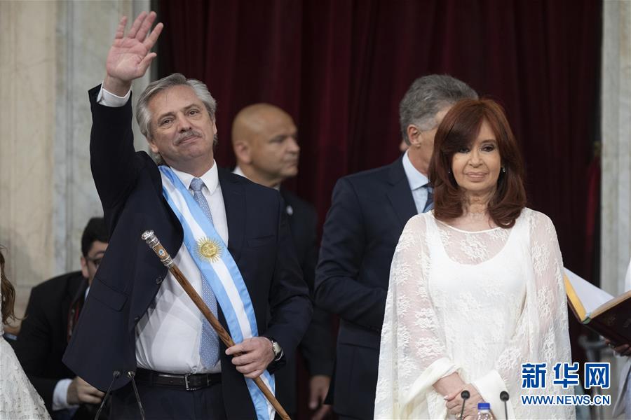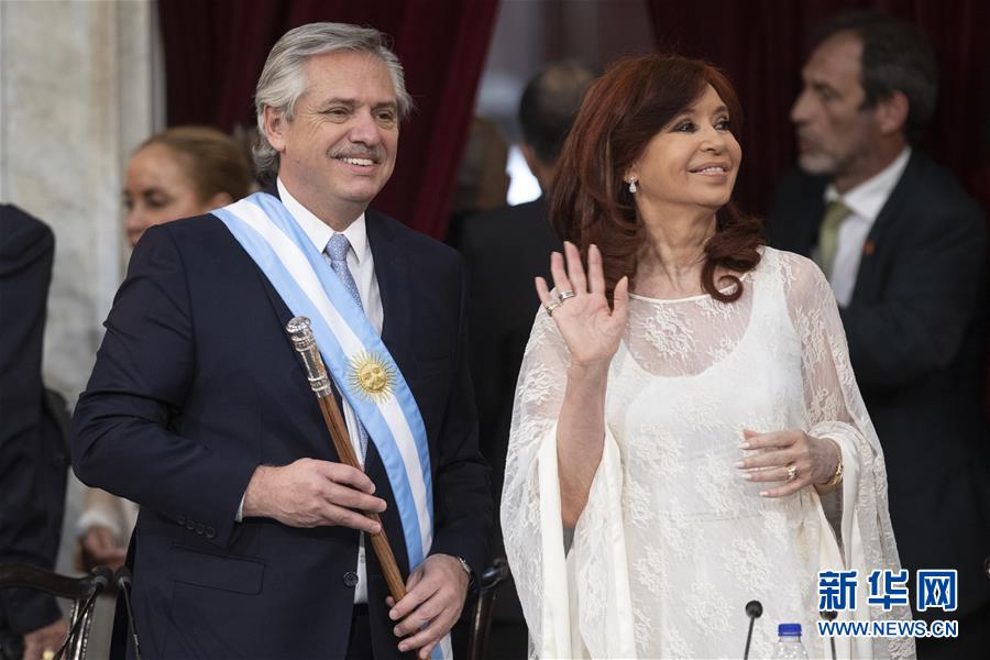 12月10日,在阿根廷布宜诺斯艾利斯,费尔南德斯(左)与副总统克里斯蒂娜出席就职仪式。10日,阿根廷总统就职仪式在布宜诺斯艾利斯举行,当选总统阿尔韦托·费尔南德斯宣誓就职。新华社发(马丁·萨巴拉摄)