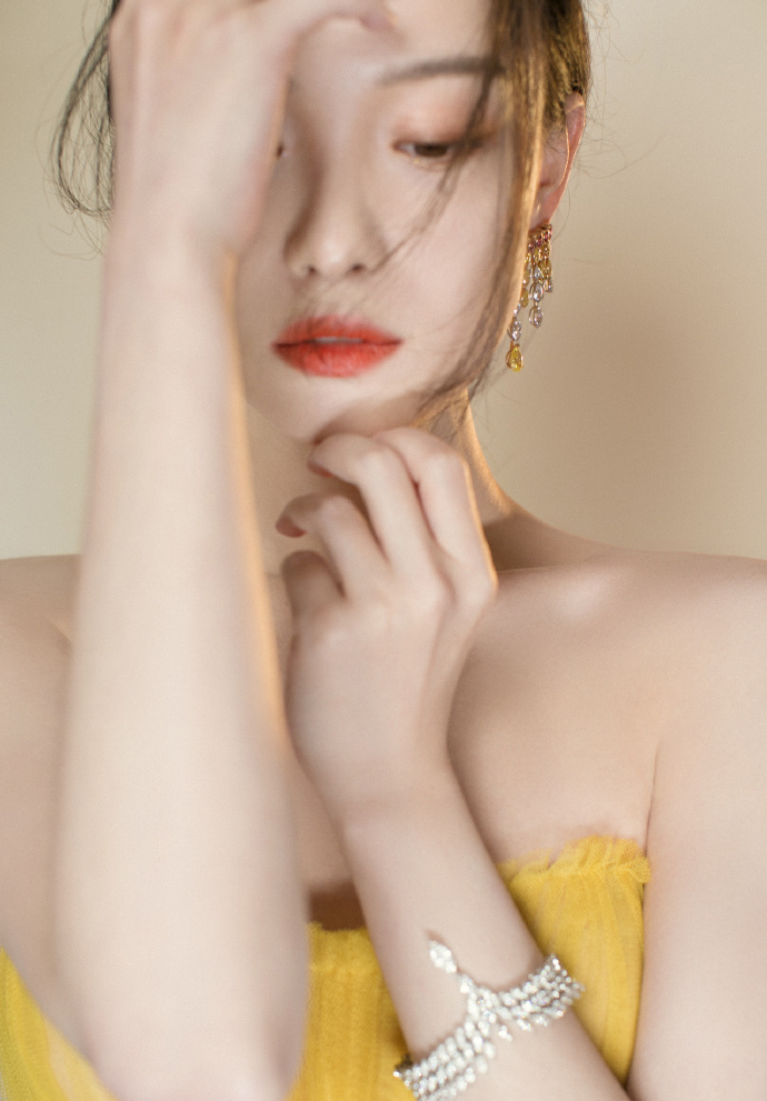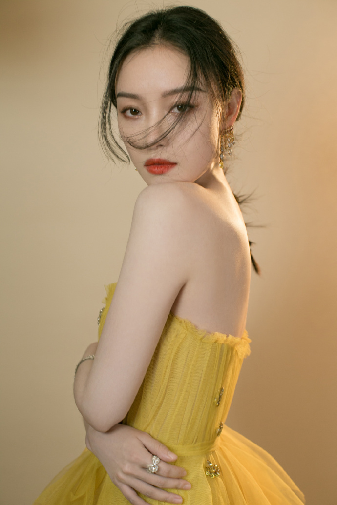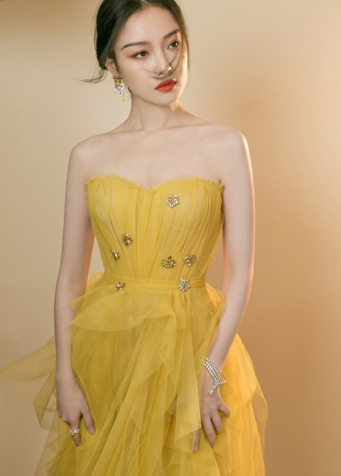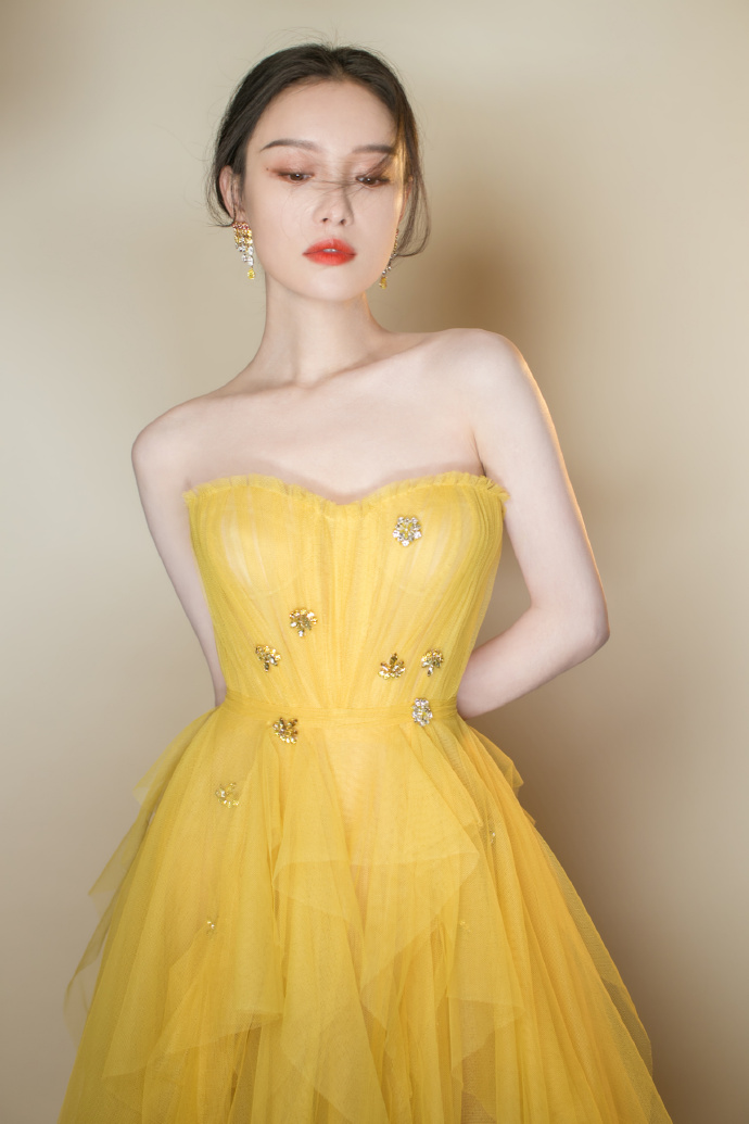 倪妮一袭鹅黄色抹胸纱裙 美若天女下凡