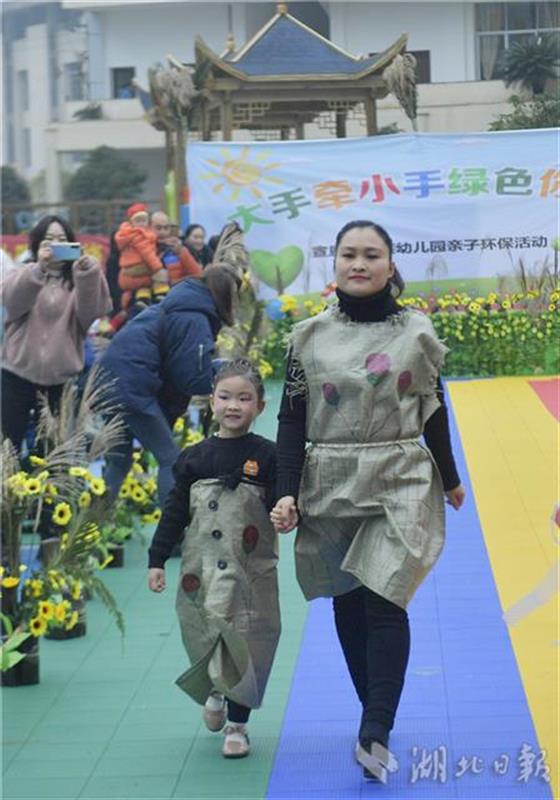 12月11日,宣恩县民族幼儿园的小朋友们和爸爸妈妈在展示自己设计的环保时装。