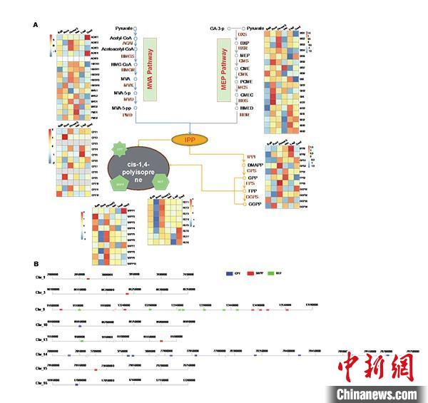 图为橡胶树胶乳的生物合成与REF/SRPP 与 CPT 基因家族的扩增。 中科院昆明植物研究所供图