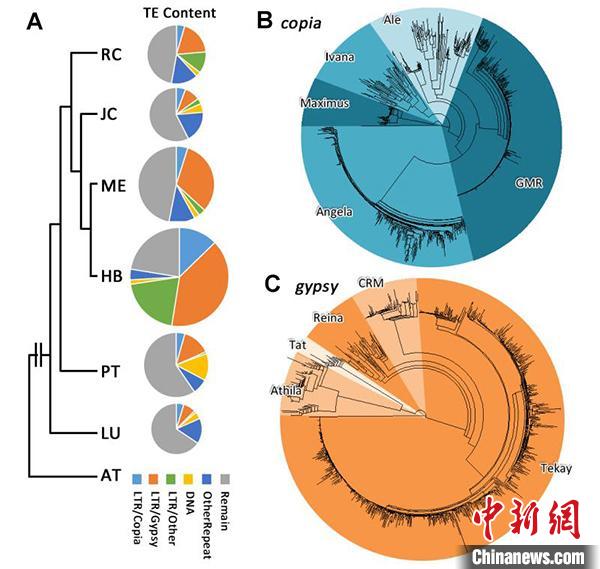 图为橡胶树基因组大小与反转录转座子家族的进化。 中科院昆明植物研究所供图