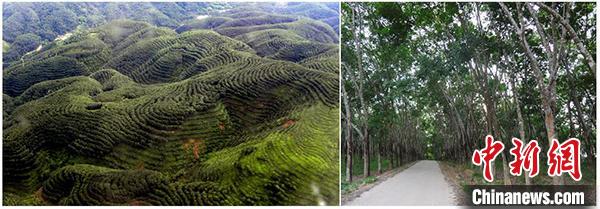 图为云南植胶区山地胶园鸟瞰图及完成了基因组测序的橡胶树 GT1 品种。 中科院昆明植物研究所供图