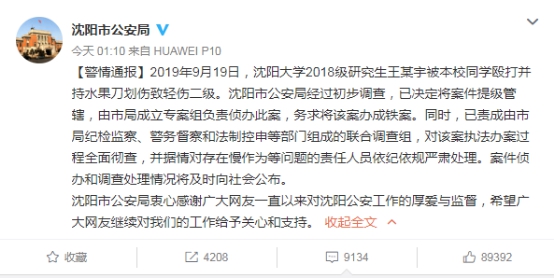 针对此事,沈阳市公安局昨晚7时许对外发布称:2019年9月19日,沈阳大学2018级男性研究生王某宇被本校男性同学马某某和两名女性同学王某桥、丛某某殴打并持水果刀划伤。王某宇到医院治疗时拨打110电话报警。王某宇在微博中称,自己被伤害的原因是奖学金评定纠纷。