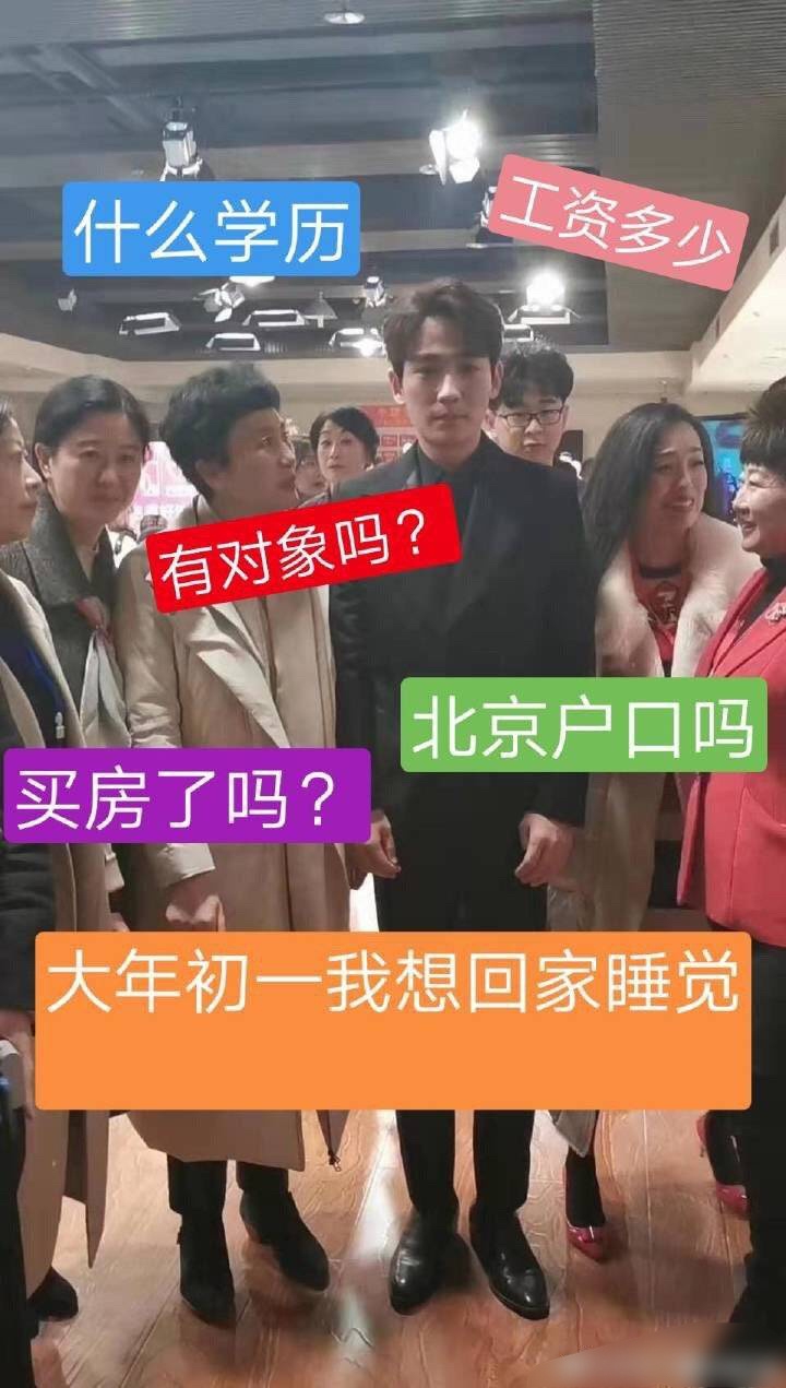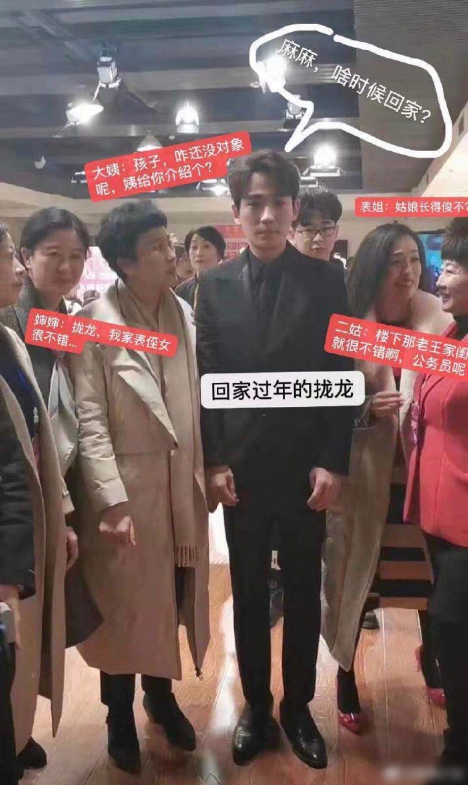 有网友曝光朱一龙在某活动场合与几位阿姨粉丝的合影。图中的朱一龙被几位阿姨粉丝围在中间,站定不动,表情保持微笑,显得呆萌可爱。有网友表示这张图像极了过年回家被亲戚围攻的自己,也P上趣味文字进行二次创作。