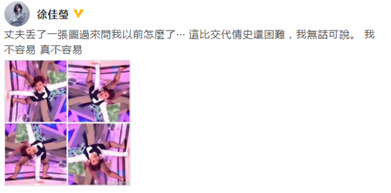 网易娱乐12月20日报道 12月20日,歌手徐佳莹在微博上晒出一张早年唱跳四格照,并配文:“丈夫丢了一张图过来问我以前怎么了...这比交代情史还困难,我无话可说。我不容易,真不容易”。照片中,还处在出道早期的徐佳莹一脸肉嘟嘟稚气未脱,微胖的她穿着稍紧的白衬衫黑西装裙在节目中大方唱跳,一边右手撑地下腰,一边十分卖力地看向镜头,活泼可爱。