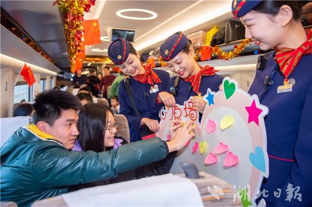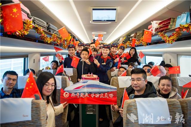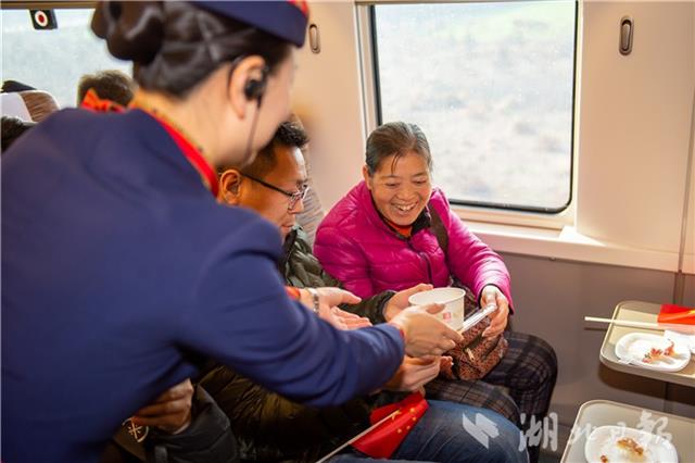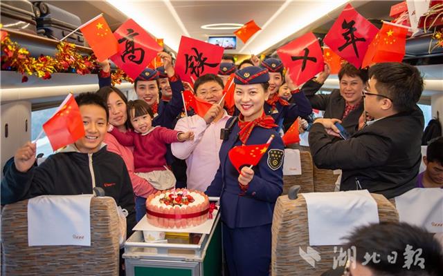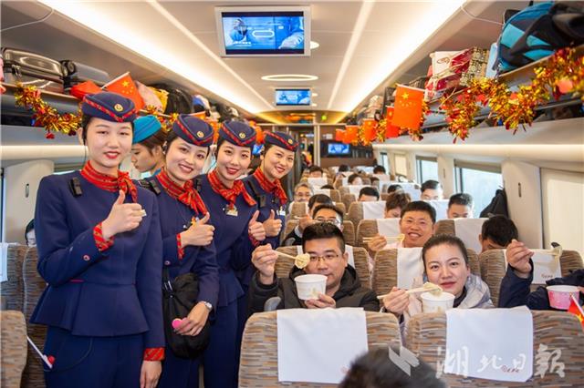 12月22日,凤舞楚天G516次乘务组与乘客一同为高铁庆生。当日,中国铁路武汉局集团有限公司武汉客运段凤舞楚天G516次乘务组举办京广高铁开通十周年活动,恰逢冬至,乘务员为旅客送上蛋糕、饺子等食物,并与旅客一起许下心愿,共同为高铁庆生。(湖北日报见习记者 蔡俊 通讯员 赵军 摄)