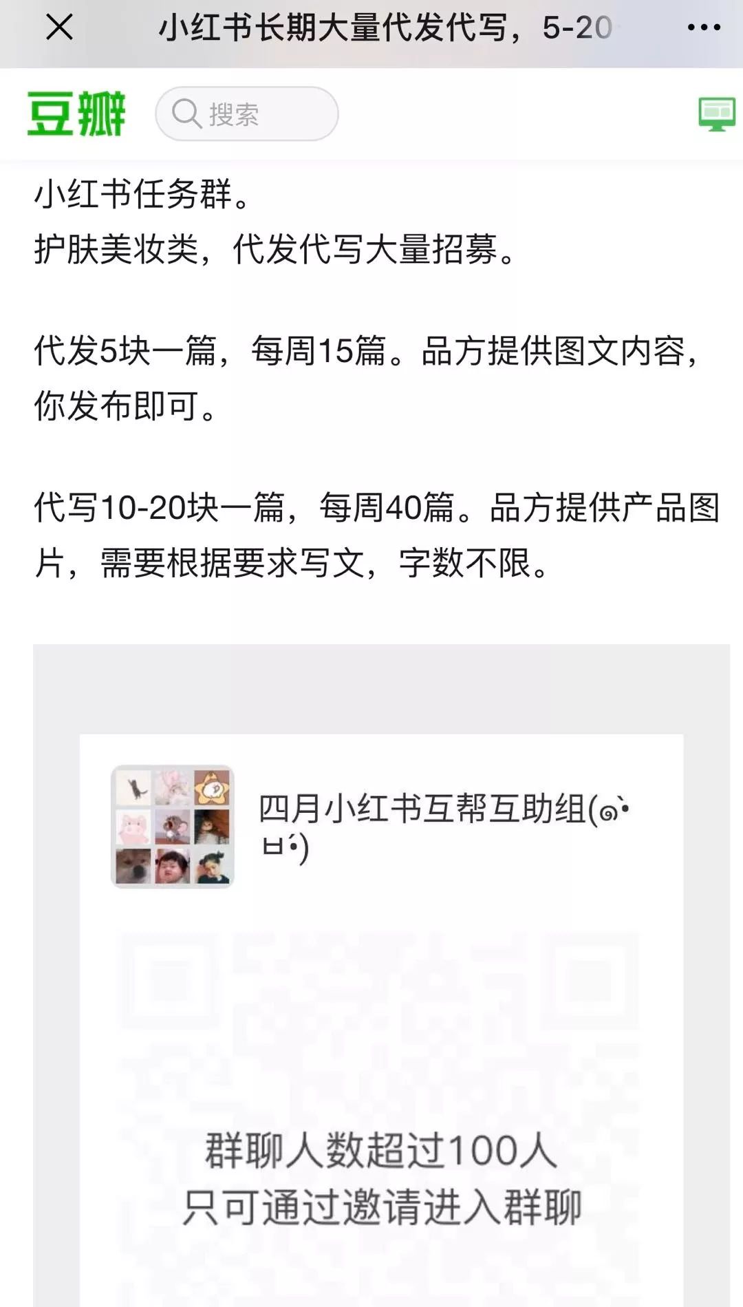 崔小姐抱着一探究竟的心情,在某公众号上添加了一个“水军”头目的微信,随即被拉入一个叫作“小红书”点赞收藏评论群。同时,她收到了一份“写手攻略”。群主每天在群里“投放任务”,写手按要求完成任务:对商品收藏、点赞,再评论。评论要求二十字以上,且要真诚自然。完成任务后截图给群主,就可以赚到一单的酬劳。