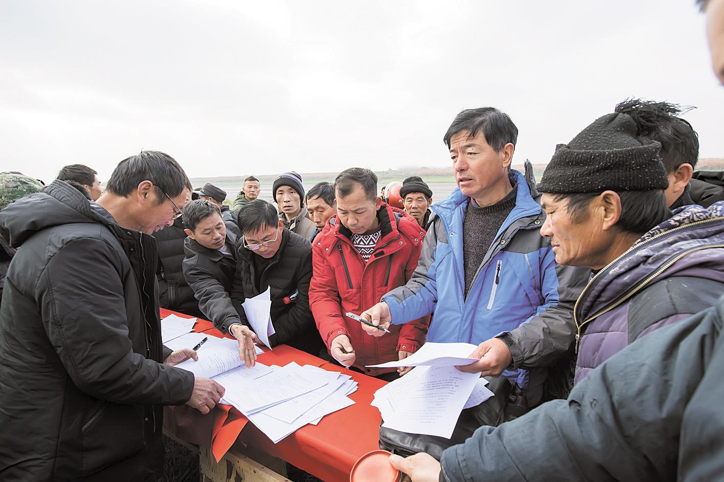岸边不远处,已完成渔船、渔具评估的渔民正在签订安置补偿协议。监利县副县长杨金勇向渔民介绍转产转业的措施,详细解释渔船渔具征收补偿、转产奖励补偿、过渡期生活补助、捕捞权收回补偿、最低生活补助等政策。