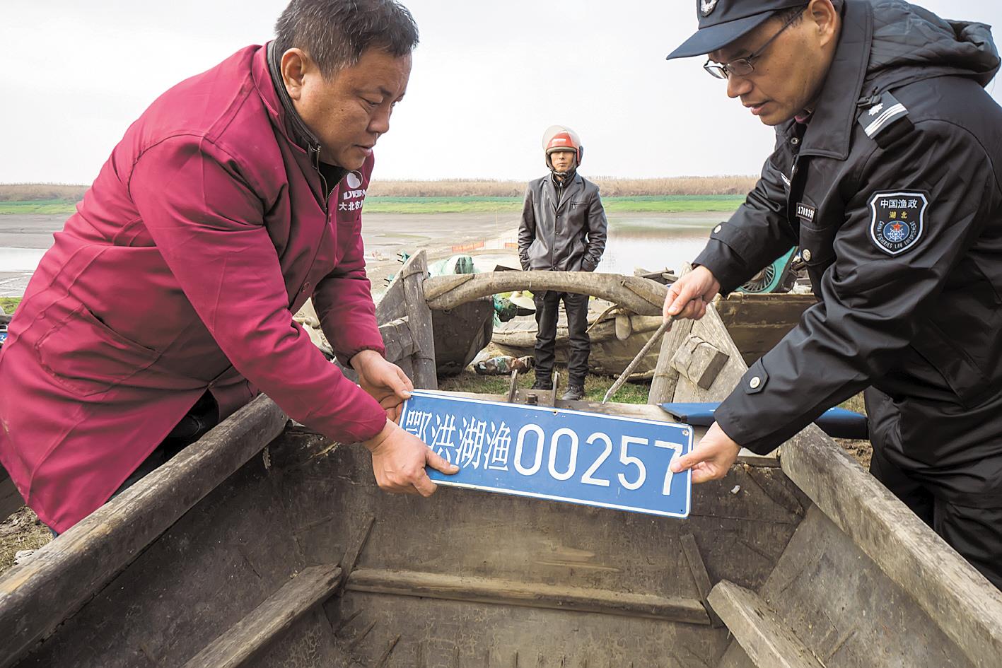 12月19日,洪湖市渔政执法人员回收渔船编号。