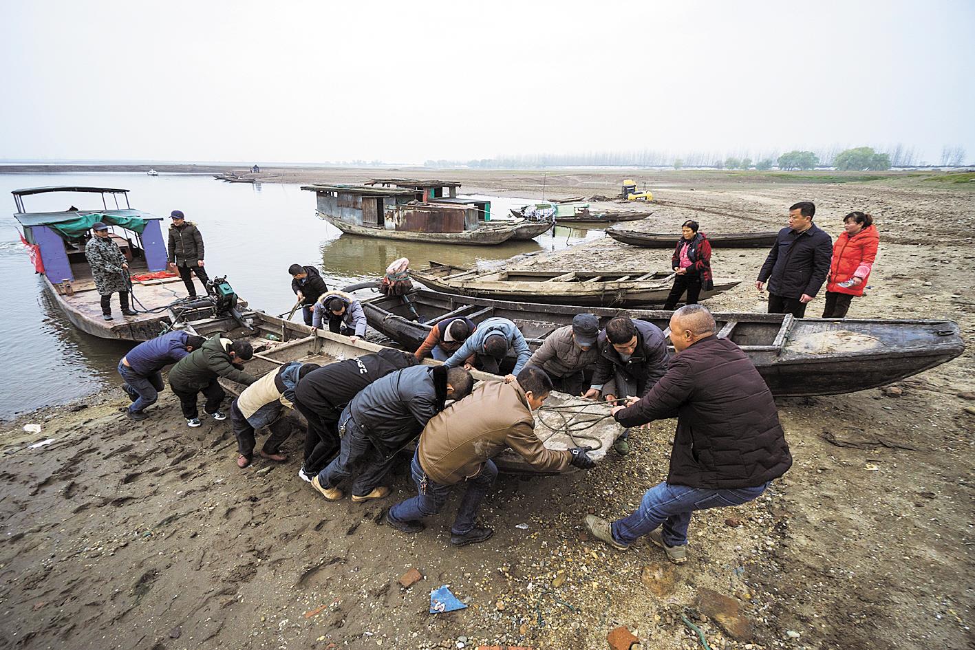 12月20日,在监利县何王庙江豚保护区缓冲区进行季节性捕捞的渔船被众人拉上岸。