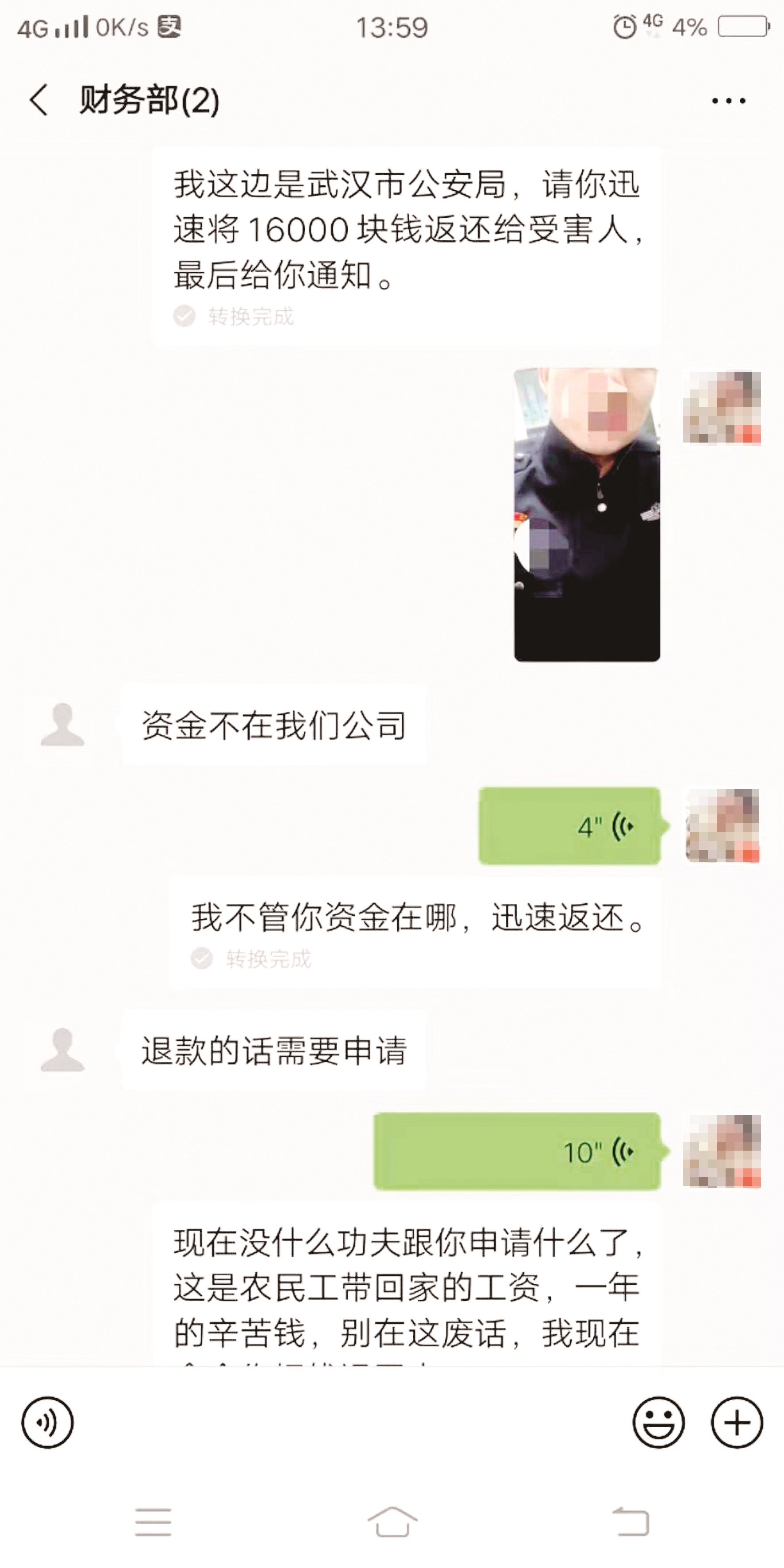 江鲲鹏明确告诉对方,公安机关已立案侦查,但骗子依然心存侥幸。挂断电话后,江鲲鹏又自拍了身着警服的照片,上面可以清晰看到警徽和警号,用常某的微信发过去。这时,骗子依然狡辩“资金不在手上”“退款需要申请”。江鲲鹏又开始进行法律宣传教育,几分钟后,骗子心理防线崩溃,将16000元如数归还。