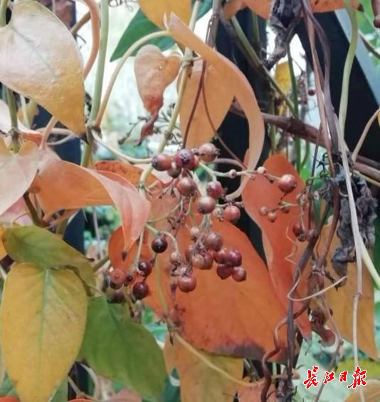 “疏桐流饷”在接受记者采访时说,12月21日,他到龟山上玩耍时,看到一丛丛藤本植物缠绕在其他树木上。其藤条长3~5米,上面挂着一颗颗半透明、圆溜溜的绿色或黄紫色果实。他觉得此植物就是鸡矢藤。