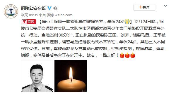 中新网12月25日电 安徽省铜陵市公安局25日通过官方微博发布消息称,24日晚,铜陵市公安局交通警察支队二大队辅警马勇执勤时被一小型越野车撞倒,经抢救无效不幸牺牲,年仅24岁。目前,驾驶员赵某及其车辆已被控制,经初步检测,排除酒驾、毒驾嫌疑。