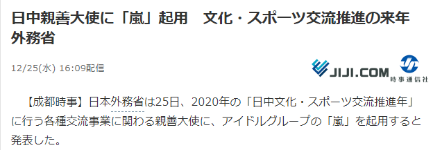 海外网12月25日电 日本外务省25日宣布, 任命日本人气偶像组合“岚”为2020年“中日文化体育交流推进年”亲善大使,届时将负责各种文化交流工作。