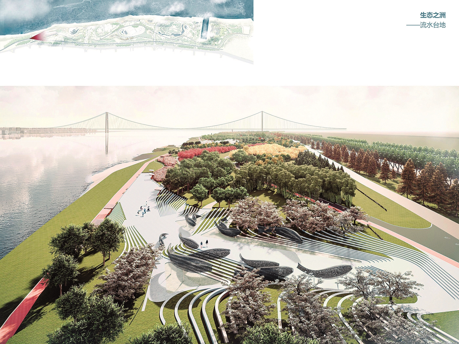 白沙洲江滩近日开工,全长3.1公里,将建设流水台地、江船逐流、落英花园三个主题广场,力争2021年完工面向市民开放。图为江滩效果图 建设方供图