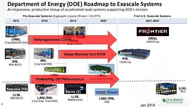 根据Jeffery博士公布的路线图,美国能源部在2021到2013年将部署3台运算速度达到E级(Exascale,每秒运算1百亿亿次)的超级计算机。