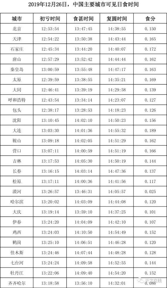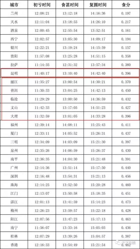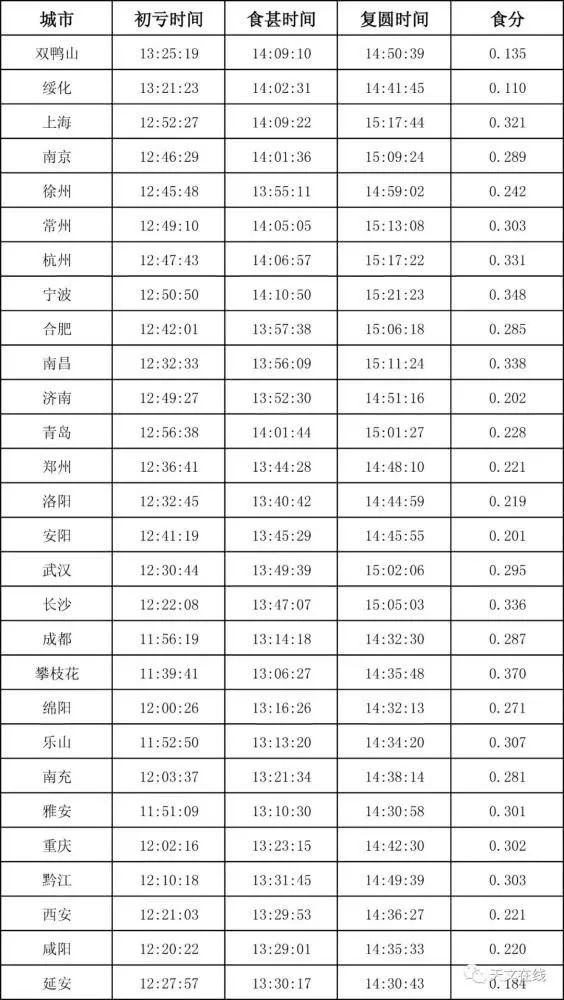 具体我国各城市的日偏食发生时间,可以参考以下的表格。