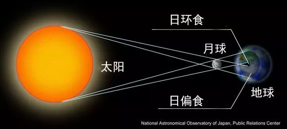 日全食是日面完全被月球遮挡,日偏食是日面有部分被月球遮挡,而日环食是日面的中心部分被月球遮挡,但其外周一圈仍可看见明亮的日面,就像一个金色的光环戒指一样。