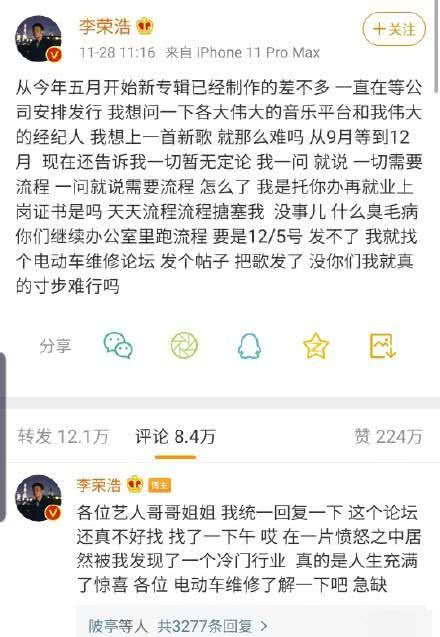 有因必有果,早在上个月前李荣浩就给自己埋下了隐患的种子。我们都知道,歌手最迫切的就是希望能有新专辑问世,可因为新专辑制作迟迟被拖延和搪塞,李荣浩公开炮轰各大音乐平台,就连自己的经纪人都不放过,并且还放狠话不需要他们,自己也可以一人包揽将新专辑给发布出去。