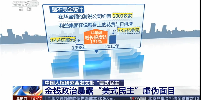 文章还指出,金钱政治是美国资本主义制度的必然产物。富人的经济利益需要通过选举参与政治来保障,政治人物需要借助金钱来进行选举。游说是一种美国特有的政治现象,游说腐败是美国政治制度与生俱来的痼疾。据不完全统计,在华盛顿的游说公司约有2000多家。利益集团在说客身上的花费与日俱增,1998年为14.4亿美元,2011年已狂飙至33.3亿美元,14年间增长幅度达131%。