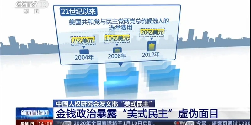 央视网消息: 中国人权研究会今天(26日)发表《金钱政治暴露“美式民主”的虚伪面目》一文。文章指出,美国一直标榜自己是民主和人权的“楷模”。但是,无所不在、根深蒂固的金钱政治彻底戳破了美国的谎言。
