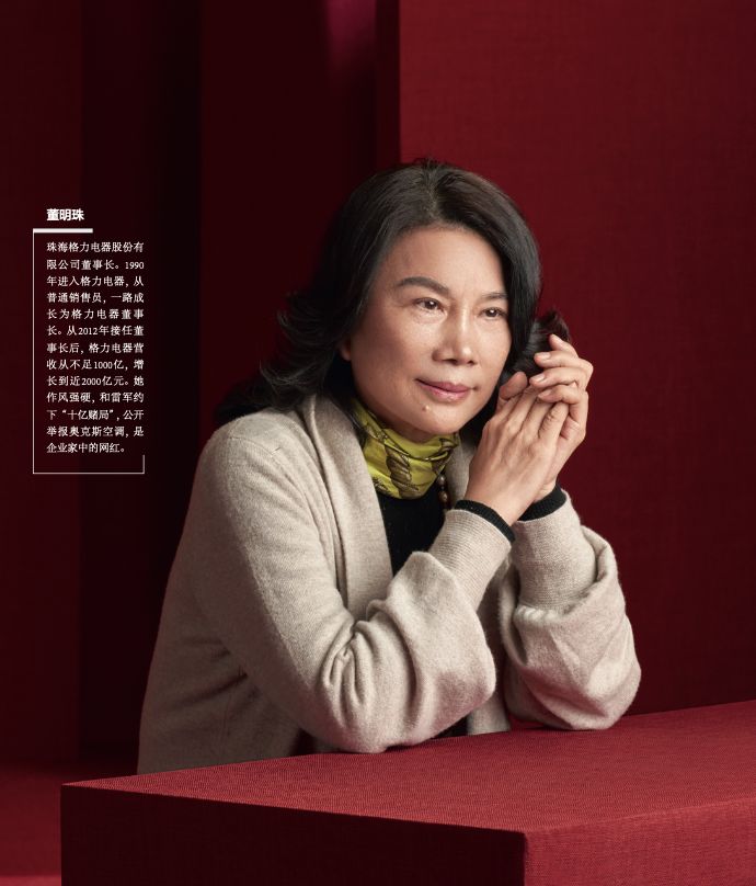 董明珠 珠海格力电器股份有限公司董事长。1990年进入格力电器,从普通销售员,一路成长为格力电器董事长。从2012年接任董事长后,格力电器营收从不足1000亿,增长到近2000亿元。她作风强硬,和雷军约下“十亿赌局”,公开举报奥克斯空调,是企业家中的网红。