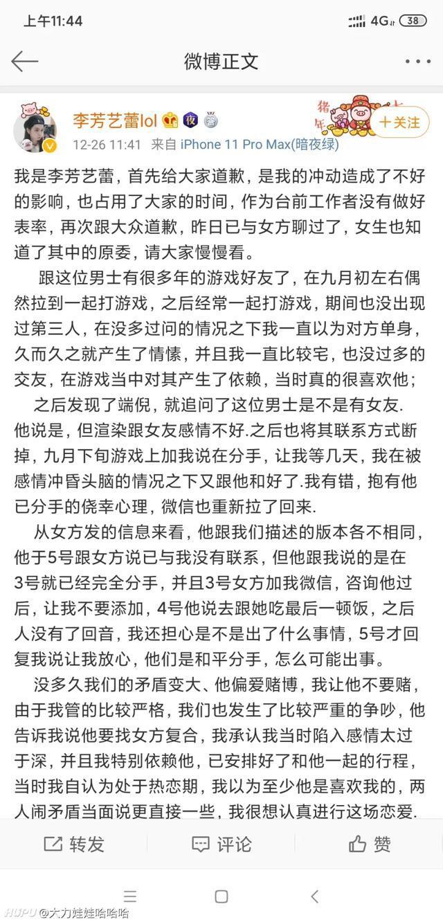 我是李芳艺蕾,首先给大家道歉,是我的冲动造成了不好的影响,也占用了大家的时间,作为台前工作者没有做好表率,再次跟大众道歉,我没有要介入别人感情当小三,昨日已与女方聊过,女生也知道了其中的原委,具体情况请大家慢慢看。