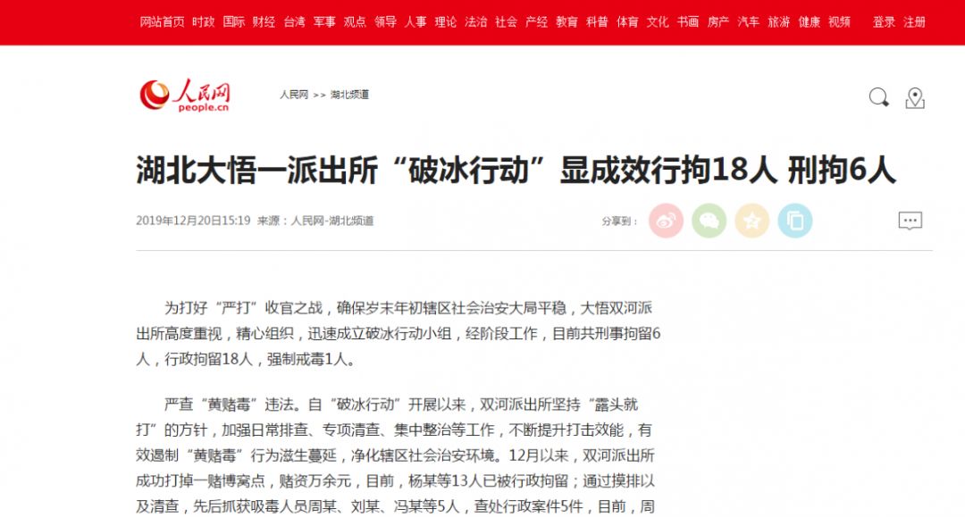 人民网12月20日报道:孝感市公安局在全市范围内启动“破冰行动”以来,大悟双河派出所高度重视,精心组织,迅速成立破冰行动小组开展“破冰”行动,加强日常排查、专项清查、集中整治等工作,有效遏制“黄赌毒”等违法行为滋生蔓延,净化辖区社会治安环境。目前,共刑事拘留6人,行政拘留18人,强制戒毒1人。