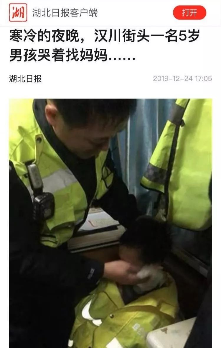 湖北日报12月24日报道:12月23日晚,寒风中,一个小男孩在汉川街头大哭着寻找妈妈,执勤民警脱下衣服为孩子取暖。经过一番紧张寻找,找到其家人。