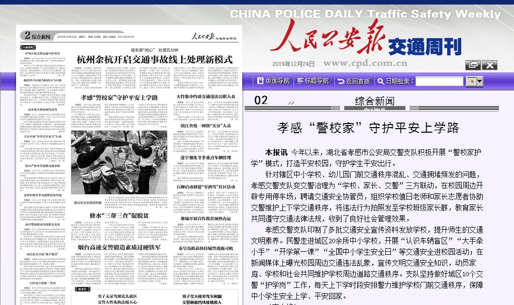 人民公安报交通周刊12月24日报道:孝感市公安局交警支队积极开展“警校家”护学模式,打造平安校园,守护学生平安出行。