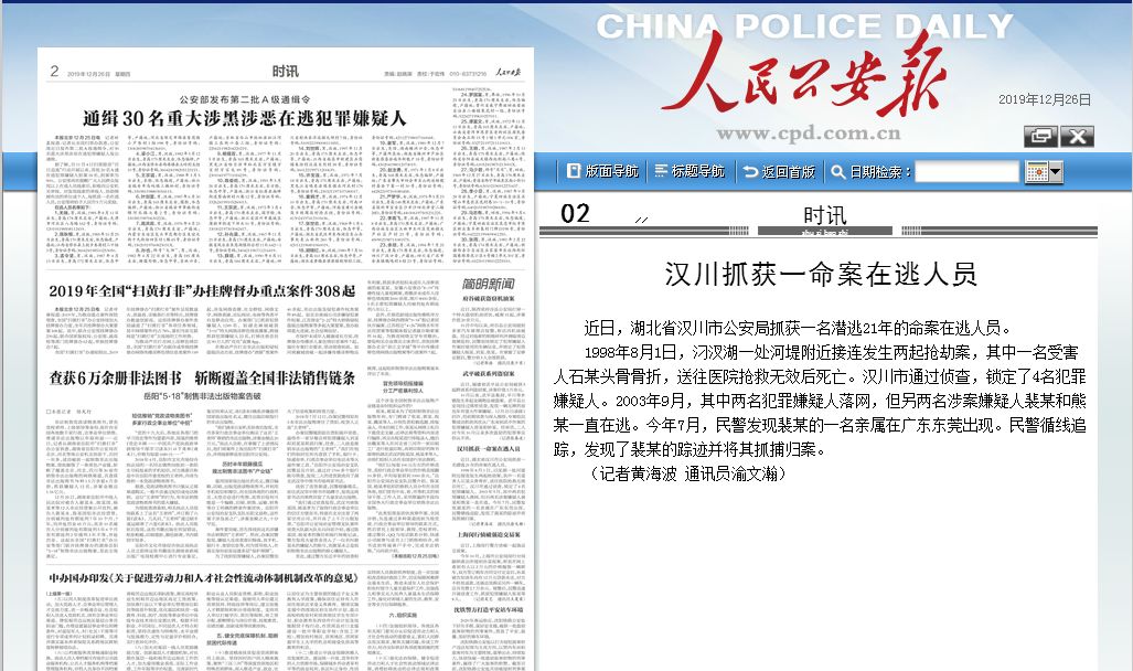 人民公安报12月26日报道:近日,汉川市公安局抓获一名潜逃21年的命案在逃人员。