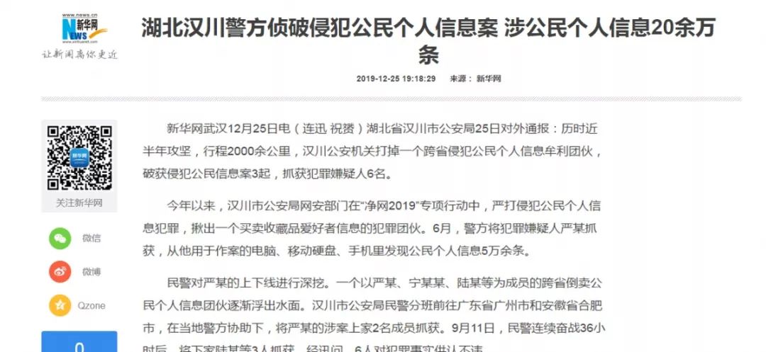 新华网12月25日报道:在“净网2019”专项行动中,汉川警方历时近半年攻坚,行程2000余公里,成功打掉一个跨省侵犯公民个人信息牟利团伙,破获侵犯公民信息案3起,抓获犯罪嫌疑人6名。