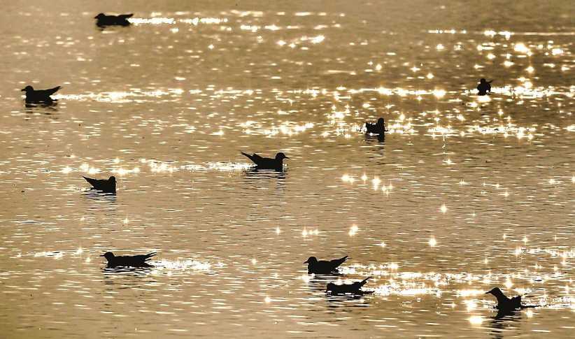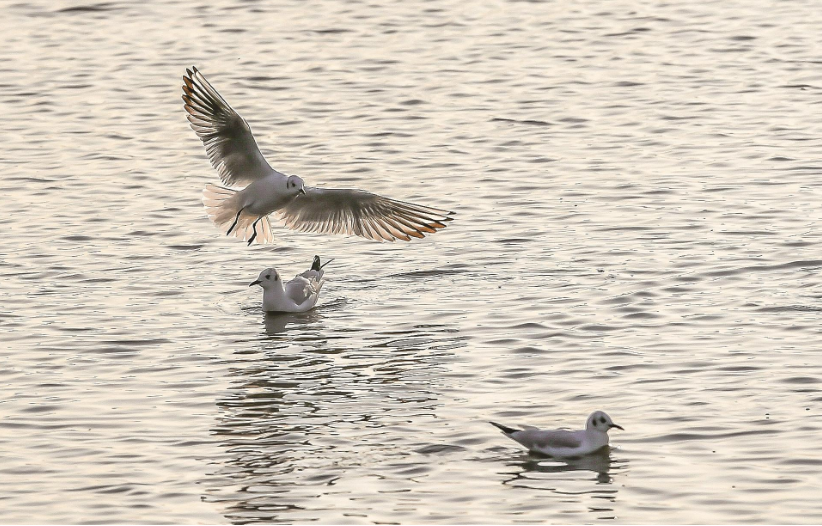 - 东湖湖面上,粼粼波光映衬下的红嘴鸥