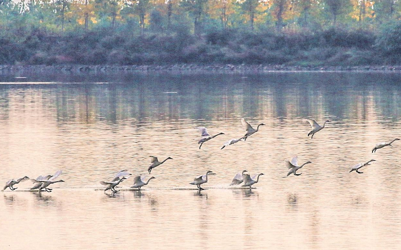 - 江夏安山国家湿地公园,小天鹅振翅起飞