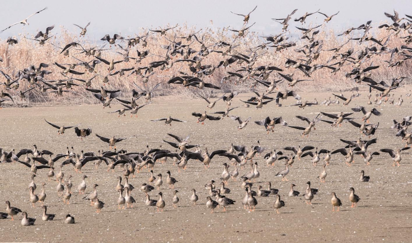 - 新洲涨渡湖,惊鸿艳影。冬日江城,有滩涂有水的地方,基本都能遇见候鸟。今年大旱少雨,候鸟群落依然稳定,为啥?武汉市观鸟协会会长颜军解释,长江、洞庭湖、鄱阳湖水位虽下降厉害,但沉湖等城市内湖泊大多有闸口来调节水位,虽少雨,因湖泊大,水位降低微乎其微,湖面依然辽阔,所以对红嘴鸥、小天鹅和鸭类等游禽没啥影响;府河水位属自然消长,每年都会大起大落,今年也还算正常。即便有水位下降的地方,滩涂变大,对于喜欢陆地的游禽大雁和鹤鹳等涉禽动物,是一大福利,因为雁类主要以草、根茎和嫩叶为食,更利于它们在滩涂上觅食,而鹤鹳等涉禽动物是以虫、小鱼虾、螺和浮游生物为食的,滩涂变大,让它们的栖息地更广阔,可容的涉禽增多,比如天兴洲上黑鹳就比去年多。“黑鹳就是站在江水边捕鱼的,滩涂变大,入水更缓,有利捕食!”“鸟儿很聪明,早就会自主选择栖息地。”冯江补充道,红嘴鸥这类食鱼的游禽会选择东湖、汤逊湖这类水面辽阔的湖泊,而沉湖红嘴鸥就很少,而同属游禽的雁类,它们更偏好滩涂和浅水区,所以沉湖雁多,雁类占比近一半。