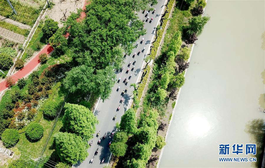 参加2019年环崇明岛国际自盟女子公路世界巡回赛的运动员在三星镇海棠花溪景区内骑行(2019年5月9日摄,无人机照片)。新华社记者 方喆 摄