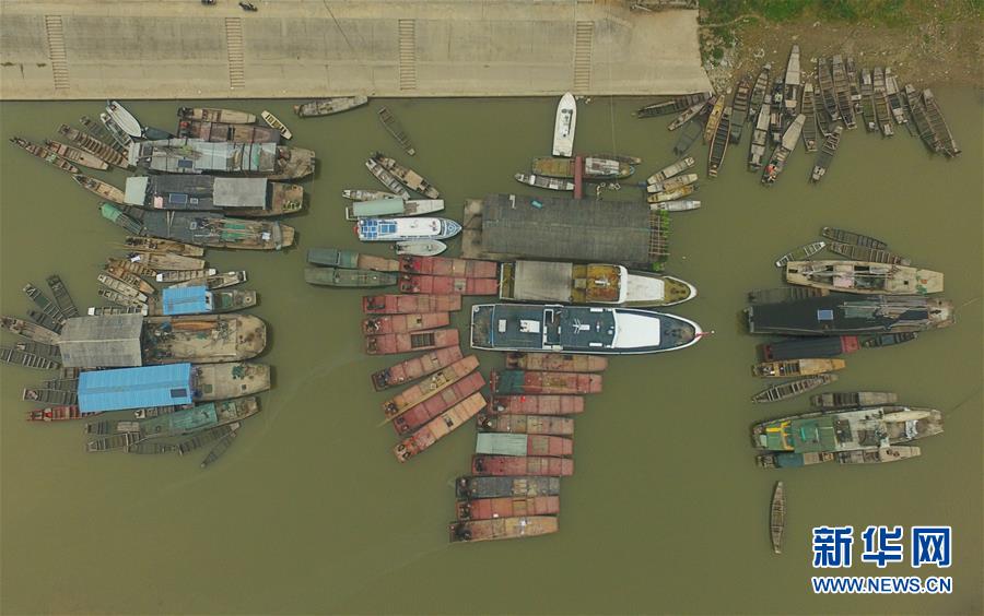在湖南常德汉寿县蒋家嘴镇,待回收的铁渔船停靠在洞庭湖边(2019年12月17日摄,无人机照片)。2020年1月1日零时起,长江流域332个自然保护区和水产种质资源保护区全面禁止生产性捕捞。长江流域各地重点水域也将相继进入为期10年的常年禁捕期。新华社记者 薛宇舸 摄