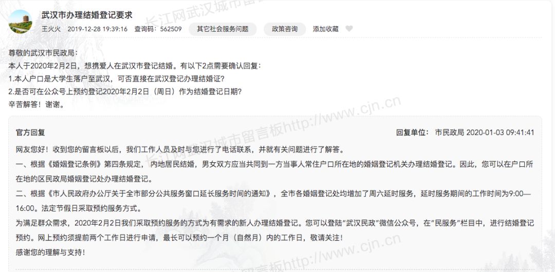 对此,武汉市民政局回应称:2020年2月2日,我们会根据市政府要求,采取预约服务的方式为有需求的新人办理结婚登记。