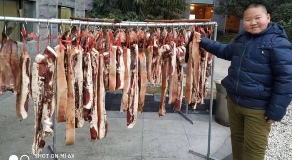 许弘带着儿子在武汉体验晒腊肉的传统风俗 本人提供