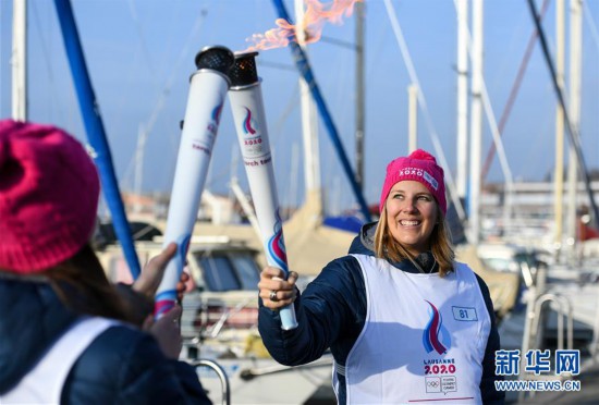 1月8日,火炬手斯科菲尔德在传递活动中。 当日,第三届冬季青年奥林匹克运动会火炬传递活动在洛桑举行。 新华社记者王建威摄
