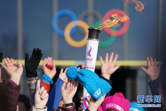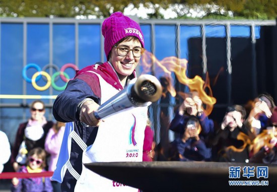 1月8日,火炬手安代尔冈在洛桑奥林匹克博物馆前点燃圣火。 当日,第三届冬季青年奥林匹克运动会火炬传递活动在洛桑举行。 新华社记者逯阳摄