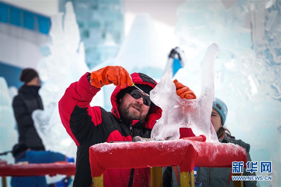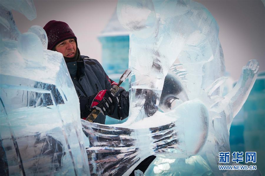 冰雕师在哈尔滨冰雪大世界内雕刻冰雕作品(1月8日摄)。 近日,在哈尔滨冰雪大世界园区内举行的各项冰雕赛事中,经过来自世界各地的冰雕选手悉心雕琢,一块块冰变身为精美的艺术作品,数十座冰雕仿佛晶莹剔透的出“冰”芙蓉。 新华社记者 王松 摄