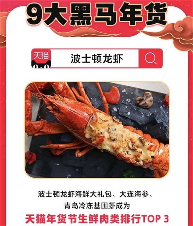 楚天都市报1月9日讯(记者周丹)海鲜大卖!今年电商年货节开卖三天,包含小型波士顿龙虾面包蟹等高端海鲜的大礼包热卖近10万件,成为生鲜肉类排行榜的top3,而另外两位上榜选手是大连海参和青岛冷冻基围虾。