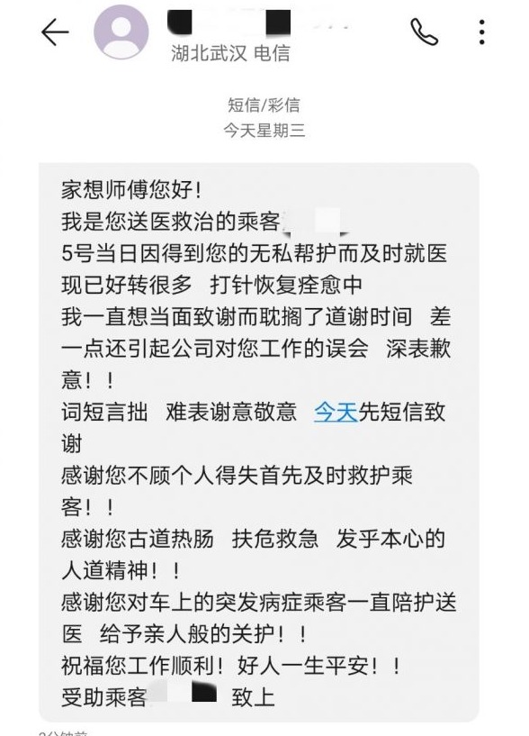 据介绍,事发时,49岁的汪女士是因颈椎病突发造成的身体不适。由于救助及时,目前她的身体已无大碍。8日,汪女士特意给胡家想发来200字的致谢短信。短信中说:“词短言拙,难表谢意敬意。感谢您的一直陪护送医,感谢您的扶危济急……祝福您工作顺利!好人一生平安!”