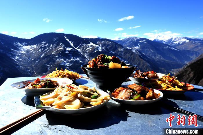 正午时分,红烧牦牛筋、腊肉香肠、红苕稀饭等一道道菜肴,从一间农家小屋里新鲜出炉,端到海拔3200多米的悬崖旁的方桌上。四川阿坝州小金县麻足寨,天蓝如洗,幽谷新雪,冬日暖阳下,白云似触手可及。甘家沟村扶贫第一书记张飞如常打开手机,用短视频记录下“云端餐厅”村民用餐的场景。