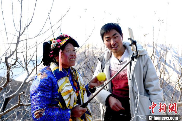 午饭后,张飞按约来到毕含珍家,几位身着传统藏袍的热心邻居正在院中帮忙装箱苹果。张飞先拍摄了一条短视频,随后又支起稳定支架,将镜头对准堆满院落的苹果,开始直播,最高峰时有5000人同时在线观看。不到40分钟,第一批装箱的40箱苹果便被网友一抢而空。