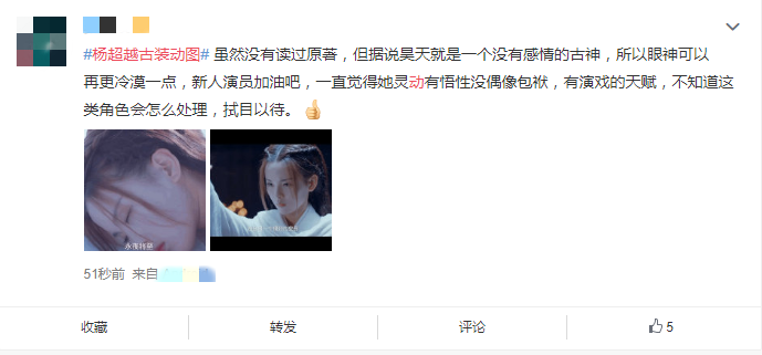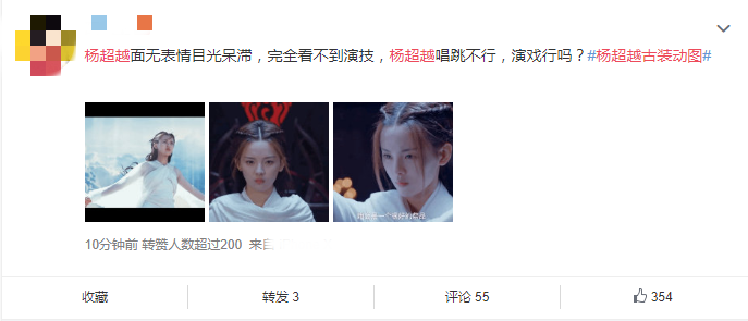 1月10日,杨超越出演的古装剧《将夜2》曝出一则视频。杨超越在剧中原声饰演天地之神昊天,一袭白衣出镜。有网友吐槽她在剧中表情呆滞,台词气息不稳,不适合演戏;也有网友表示剧中角色设定就是没有感情的神,表演没有问题。