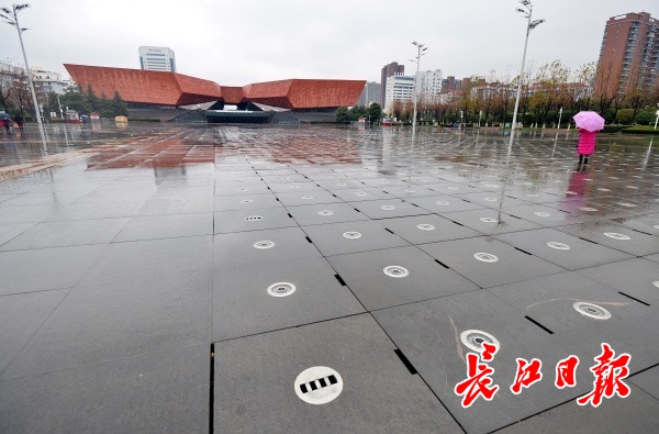 1月9日中午,首义广场音乐喷泉处,冷雨中不时有市民步履匆匆走过。长江网记者看到,喷泉东西两侧各有26个喷泉孔,长方形的喷泉孔中部焊接有小钢片,行人可以在上方平稳走过。去年夏天,喷泉进行改造时,喷泉孔大开,行人走过还有“卡脚”风险。